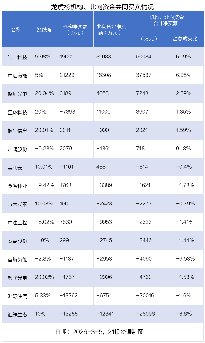 值得注意的是,机构和北向资金共同净买入了岩山科技、中远海能、聚灿光电;共同净卖出了首航新能、聚飞光电、洲际油气、汇绿生态;在星环科技,美利云,铜牛信息,川润股份,方大炭素,泰嘉股份,登海种业,中油工程上出现分歧,机构净卖出星环科技7392.68万元,北向资金净买入1.1亿元;机构净卖出美利云1100.91万元,北向资金净买入486.49万元;机构净买入铜牛信息3011.08万元,北向资金净卖出990.45万元;机构净买入川润股份2079.19万元,北向资金净卖出1360.99万元;机构净买入方大炭素149.55万元,北向资金净卖出2422.79万元;机构净买入泰嘉股份299.04万元,北向资金净卖出2744.76万元;机构净买入登海种业1768.39万元,北向资金净卖出3389.36万元;机构净买入中油工程7630.05万元,北向资金净卖出9952.81万元。