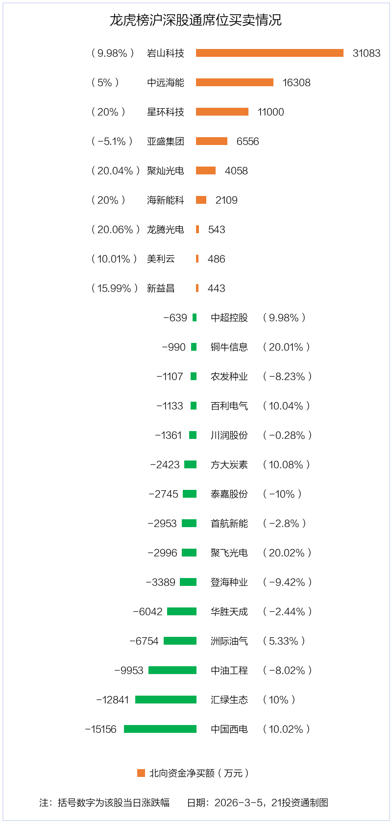 3月5日,北向资金参与龙虎榜中的个股共有24只,合计净买入2105.68万元。其中沪股通净买入5 股,净卖出7 股,合计净卖出7716.5万元;深股通净买入4 股,净卖出8 股,合计净买入9822.18万元。