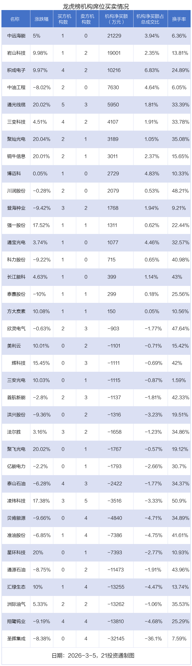 3月5日,36只个股龙虎榜出现了机构的身影,机构合计净卖出3.65亿元。具体来看,机构净买入17股,净卖出19股。