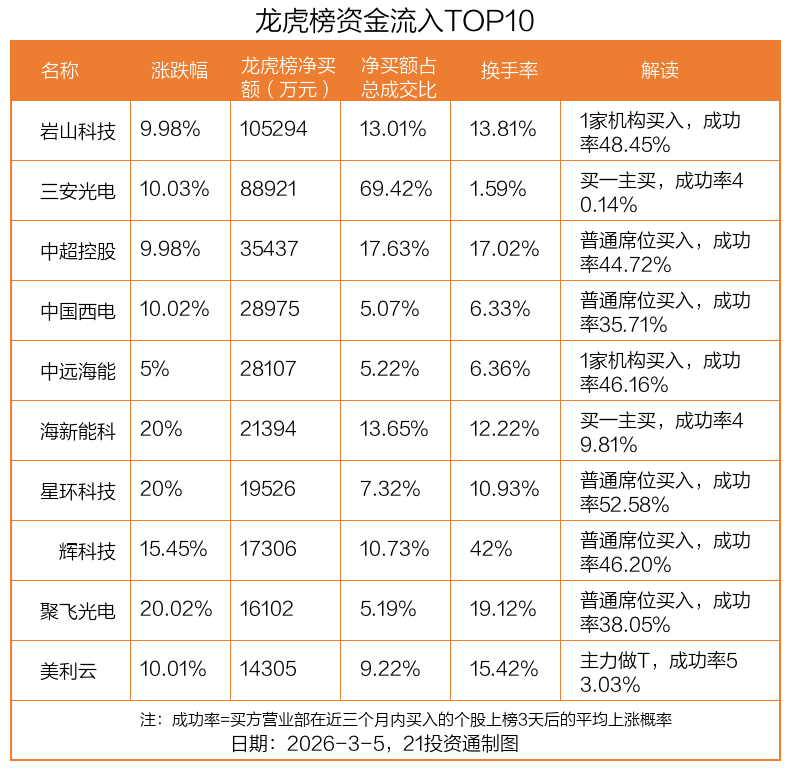 3月5日,上证指数上涨0.64%,深证成指上涨1.23%,创业板指上涨1.66%。盘后龙虎榜数据显示,共有55只个股因当日异动登上龙虎榜,资金净流入最多的是岩山科技(002195.SZ),达10.53亿元。