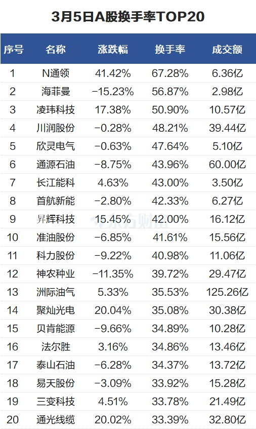 当天换手率最高的个股为N通领,全天换手率67.28%。海菲曼紧随其后,全天换手率56.87%。