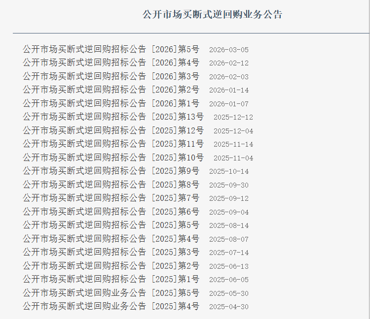 中国人民银行3月5日公告,为保持银行体系流动性充裕,2026年3月6日,中国人民银行将以固定数量、利率招标、多重价位中标方式开展8000亿元买断式逆回购操作,期限为3个月(91天)。