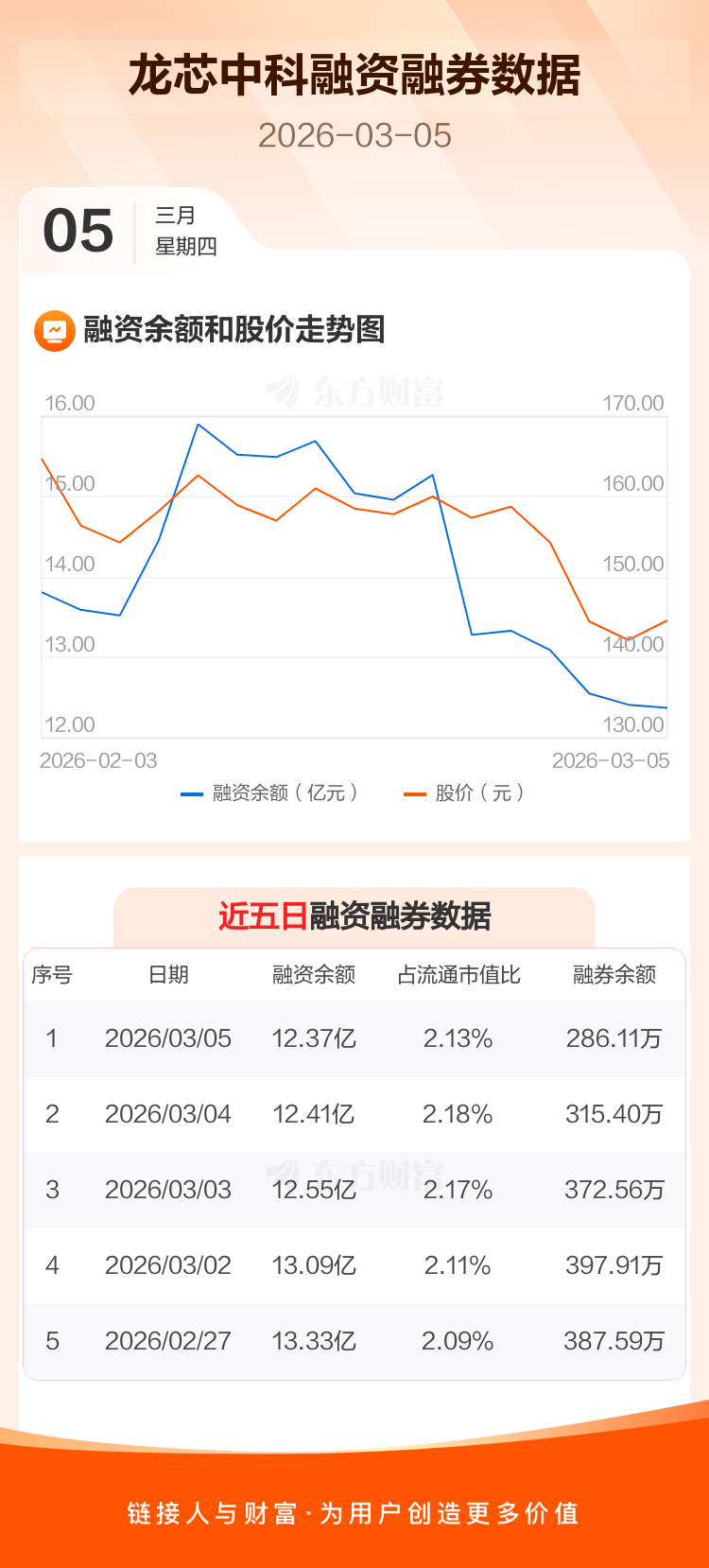 交易所最新数据显示,龙芯中科于2026年3月5日获融资买入5410.57万元,融资偿还5879.19万元,当日融资净偿还468.62万元。目前,该股融资余额12.37亿,占流通市值比例为2.13%。