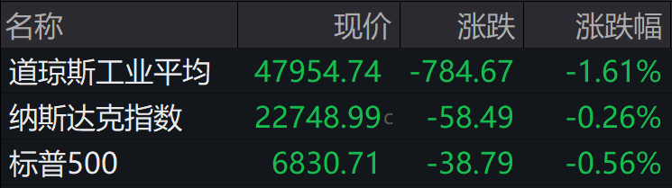 当地时间周四,美股三大股指集体收跌,道指跌近800点。截至收盘,道指跌1.61%,标普500指数跌0.56%,纳指跌0.26%。
