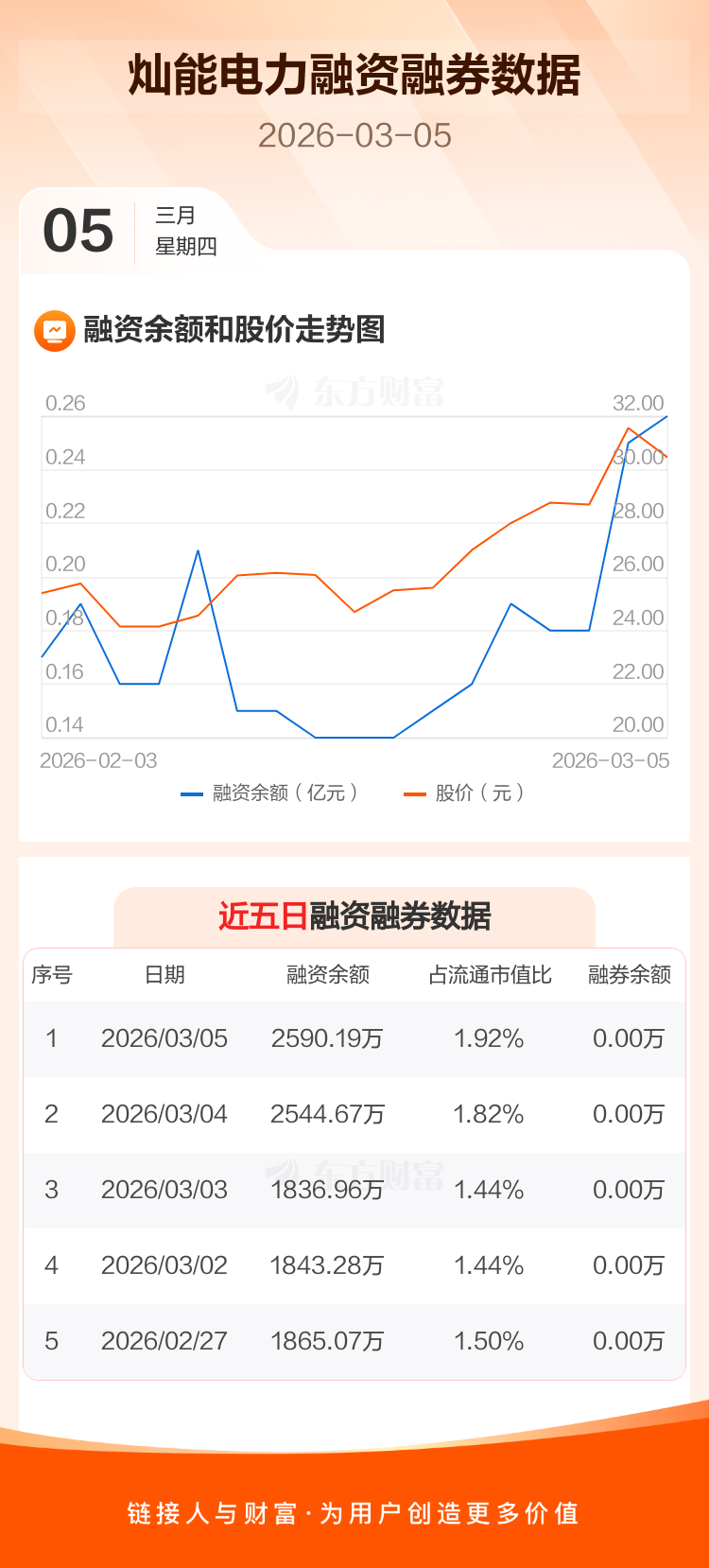交易所最新数据显示,灿能电力于2026年3月5日获融资买入1362.04万元,融资偿还1316.51万元,当日融资净买入45.53万元。目前,该股融资余额2590.19万,占流通市值比例为1.92%。