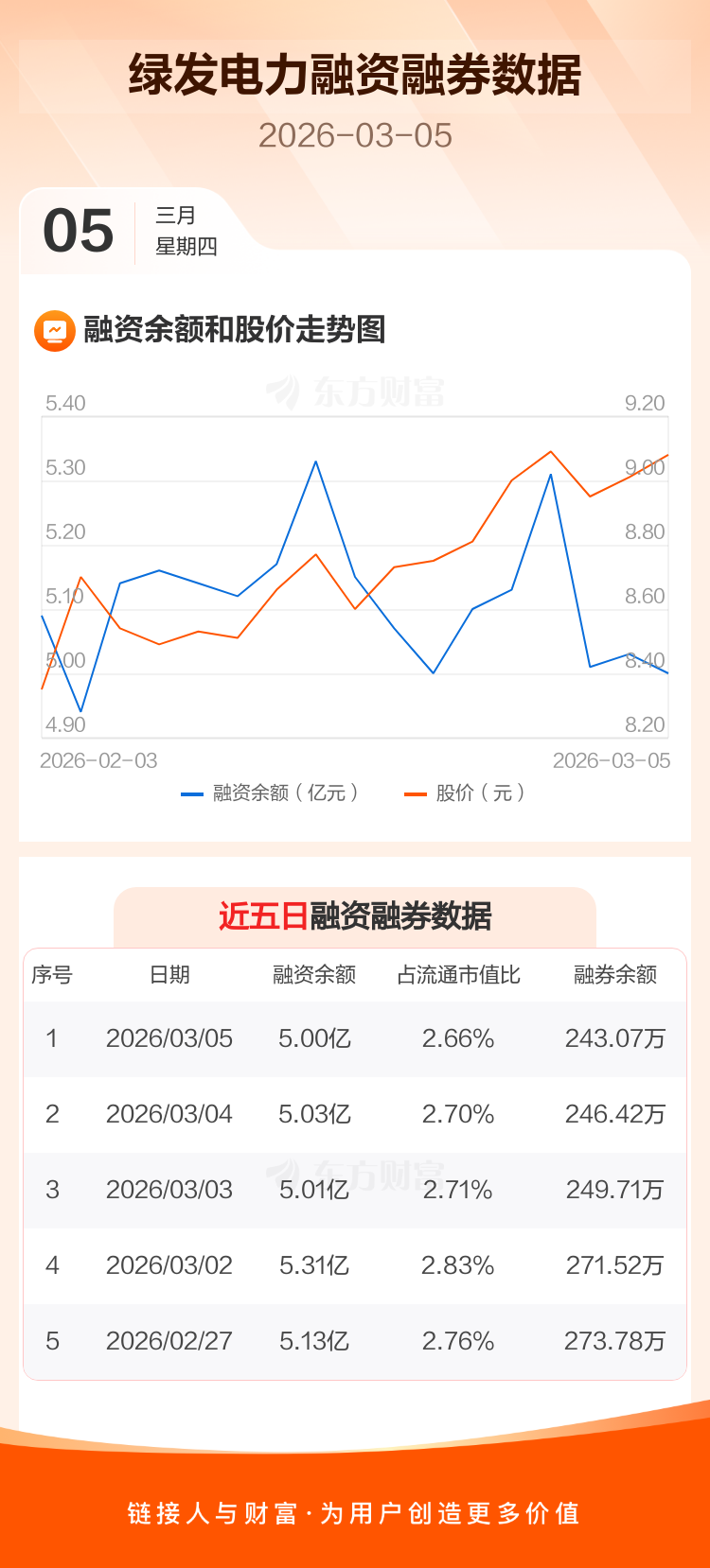 交易所最新数据显示,绿发电力于2026年3月5日获融资买入3190.57万元,融资偿还3537.60万元,当日融资净偿还347.04万元。目前,该股融资余额5.00亿,占流通市值比例为2.66%。