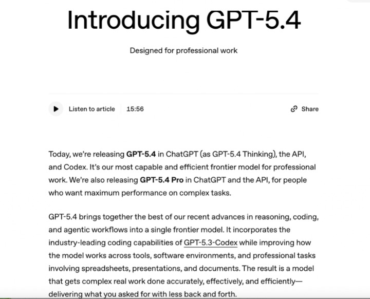 OpenAI发布GPT-5.4及GPT-5.4 Pro模型
