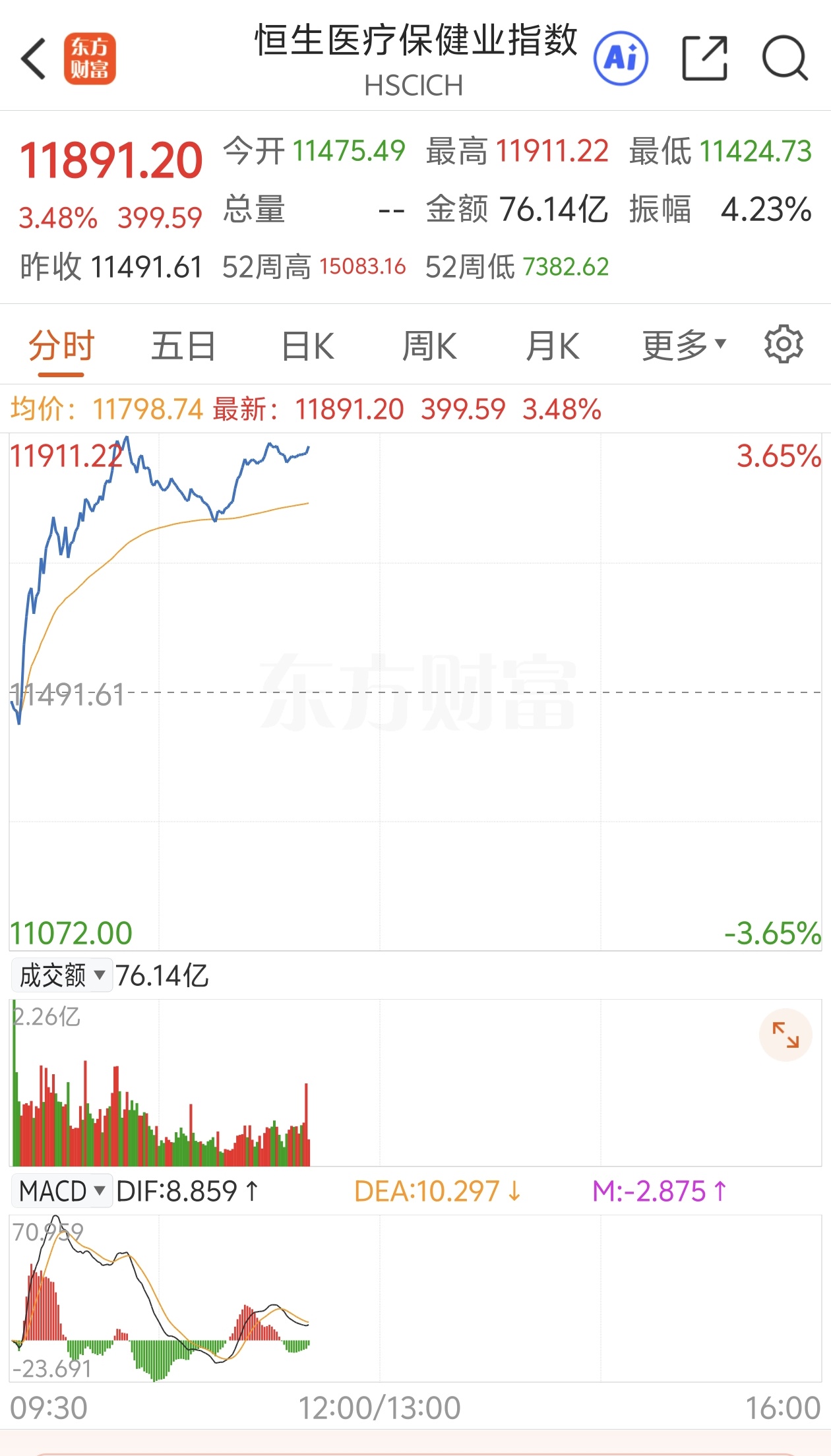 上证报中国证券网讯3月6日,恒生医疗保健业指数大涨,截至11时30分,该指数涨3.48%。药捷安康-B涨超33%,佰泽医疗、三生制药涨超10%,和黄医药、一脉阳光、映恩生物-B涨超7%。
