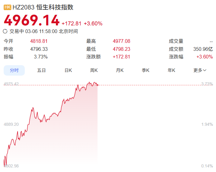 港股市场今天上午走高,恒生科技指数走势则更为强劲,盘中涨幅超过3%,多只成份股大涨。
