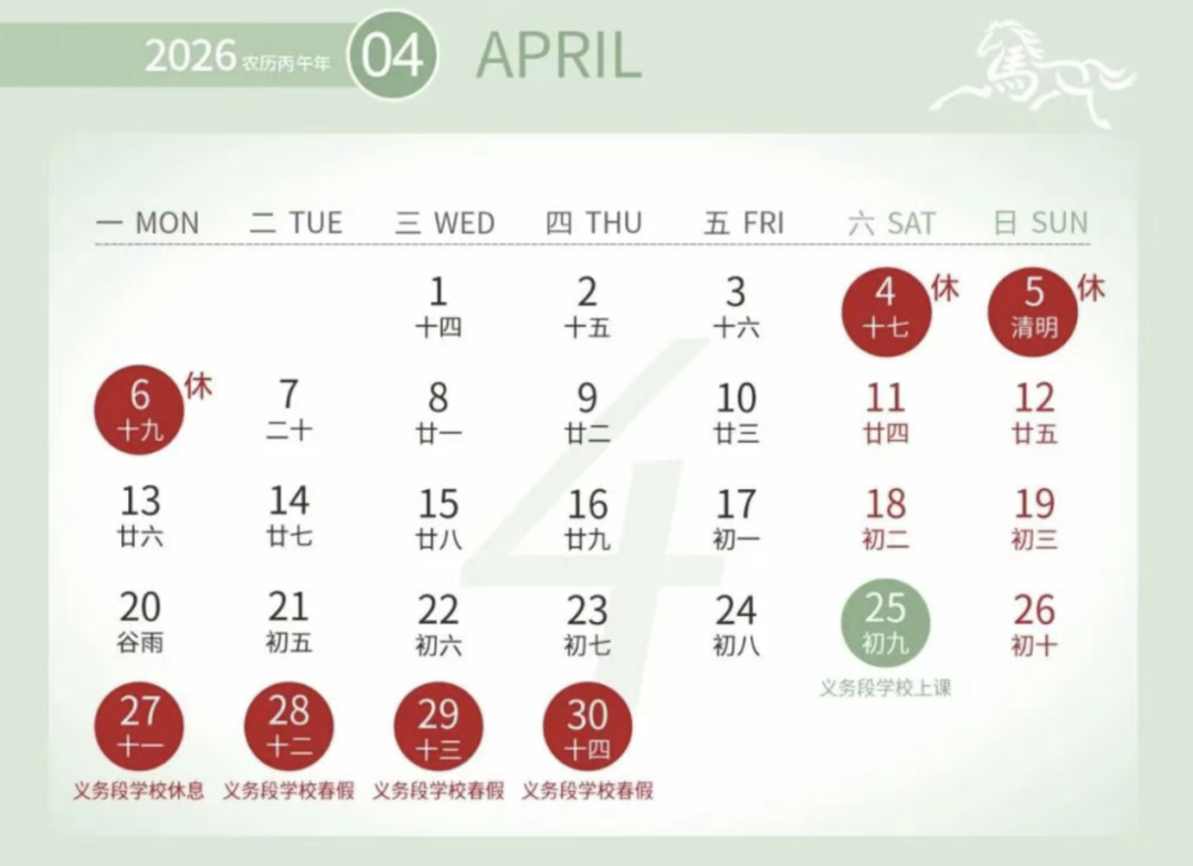 据“临平教育发布”,4月28日(星期二)至30日(星期四)放假,共3天。4月25日(星期六)上课,4月26日(星期日)至27日(星期一)休息。春假期间(4月28日至30日),孩子无人看管的家庭可向学校申请托管,学校应当提供托管服务。
