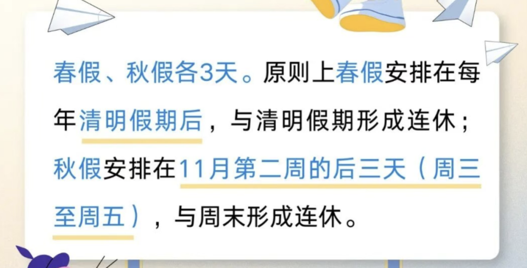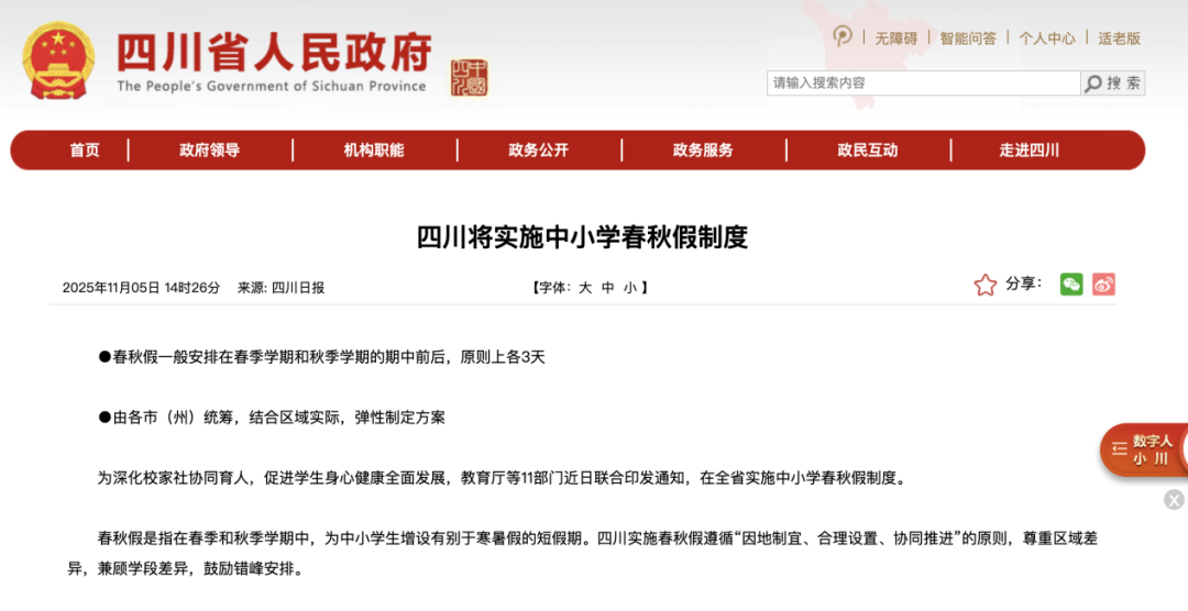 2025年11月5日,为深化校家社协同育人,促进学生身心健康全面发展,四川省教育厅等十一部门联合印发通知,在全省实施中小学春秋假制度。