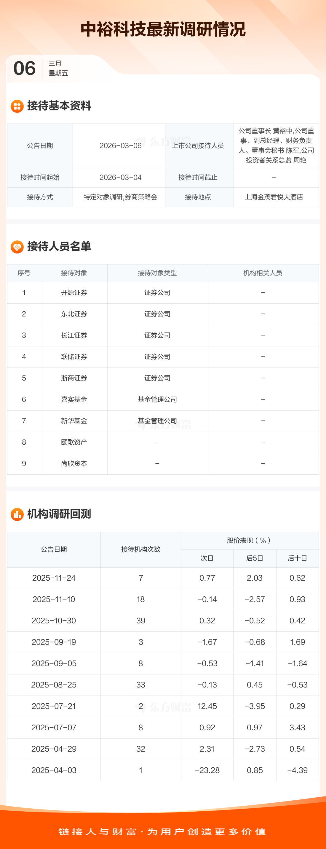 中裕科技3月6日公告称,3月4日接待开源证券等9家机构调研。接待人员包括公司董事长 黄裕中,公司董事、副总经理、财务负责人、董事会秘书 陈军,公司投资者关系总监 周艳。