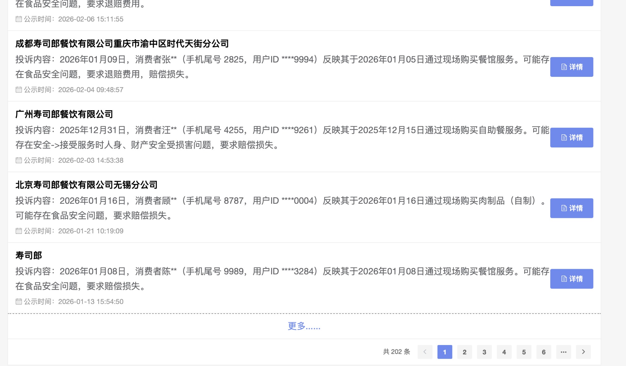 然而,当消费者在门店吃出疑似寄生虫卵、全国12315投诉平台一年出现200多条涉及食品安全的投诉时,寿司郎这套被反复强调的“极致卫生管理体系”,开始面临现实拷问。