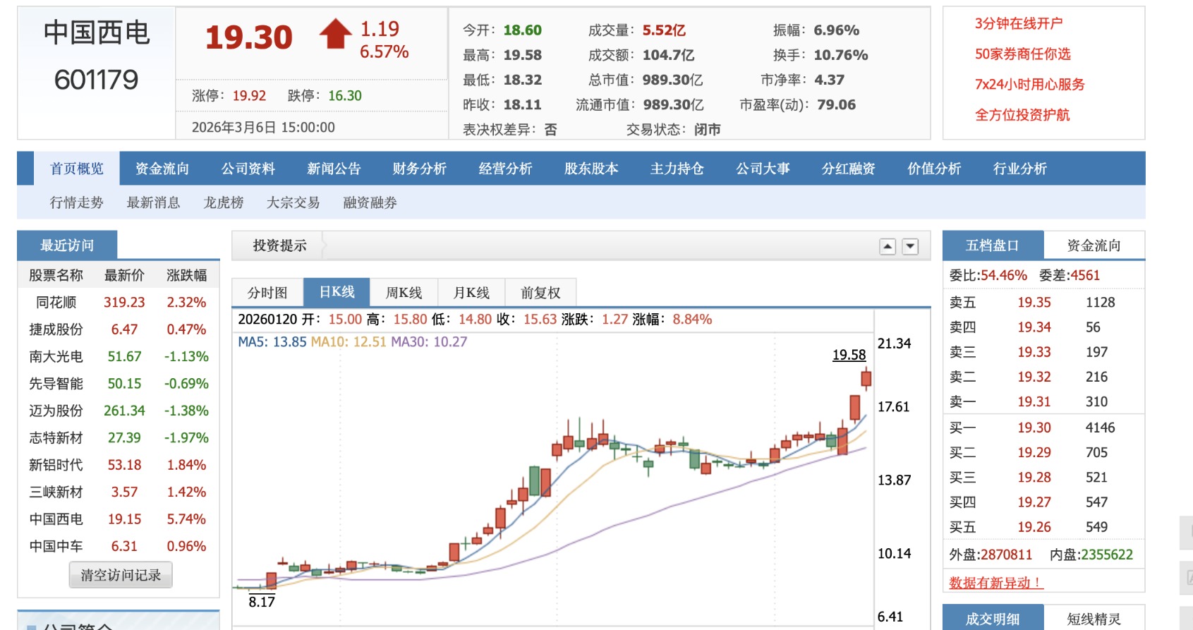 截至3月6日收盘,中国西电股价报收19.3元/股,涨幅达6.57%,市值为989.3亿元。盘中股价最高触及19.58元/股,市值首破千亿元。