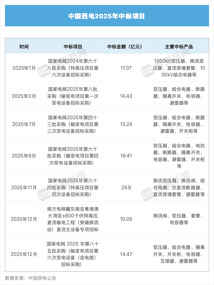界面新闻据中国西电公告统计,2025年该公司累计披露南方电网及国家电网中标项目7个,中标总金额超115亿元。