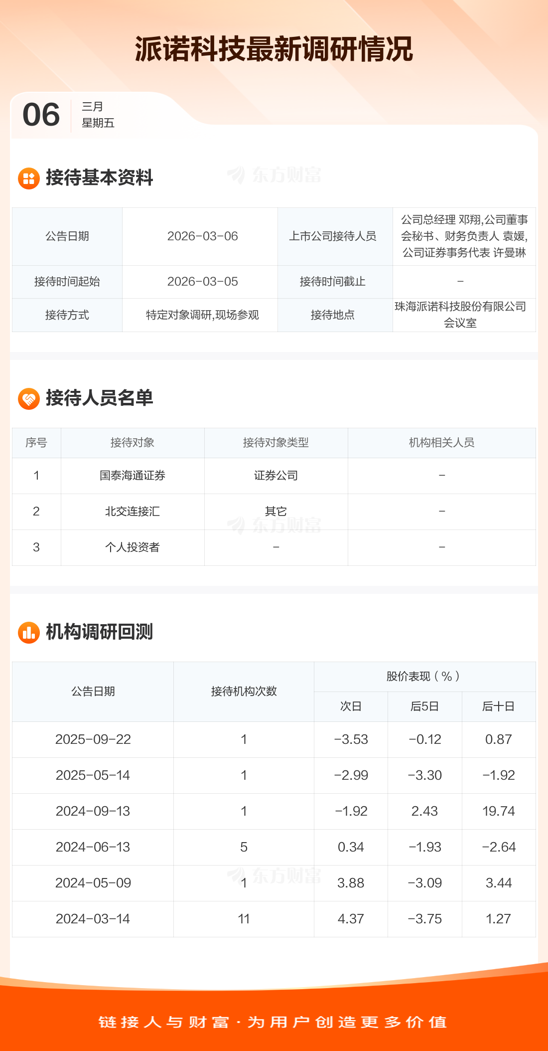 派诺科技3月6日公告称,3月5日接待国泰海通证券等3家机构调研。接待人员包括公司总经理 邓翔,公司董事会秘书、财务负责人 袁媛,公司证券事务代表 许曼琳。