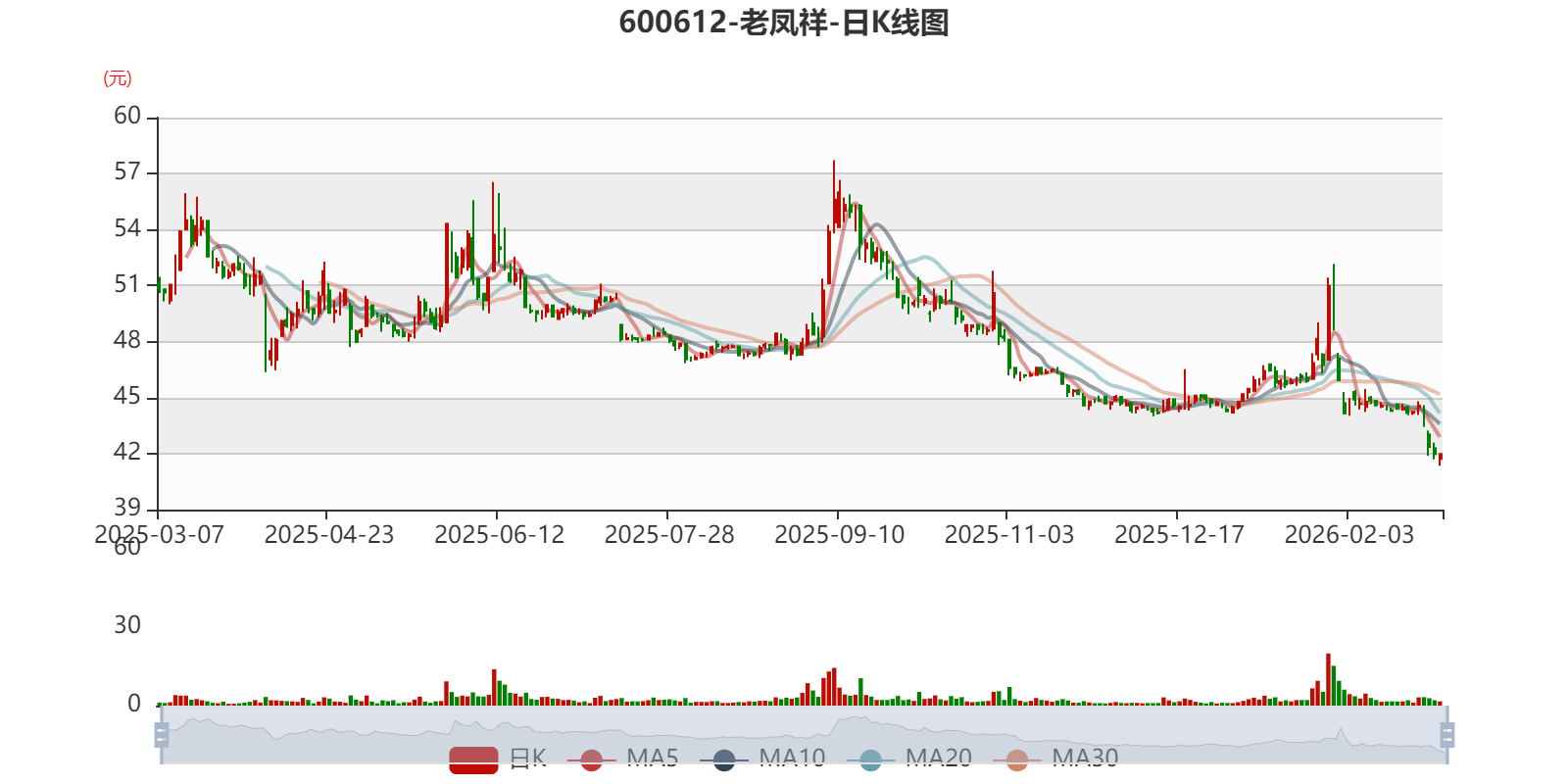 中证智能财讯老凤祥(600612)3月6日晚间披露2025年业绩快报,公司实现营业收入528.23亿元,同比下降6.99%;归母净利润17.55亿元,同比下降9.99%;扣非净利润15.88亿元,同比下降11.92%;基本每股收益3.3548元,加权平均净资产收益率为13.64%。以3月6日收盘价计算,老凤祥目前市盈率(TTM)约为12.51倍,市净率(LF)约1.71倍,市销率(TTM)约0.42倍。