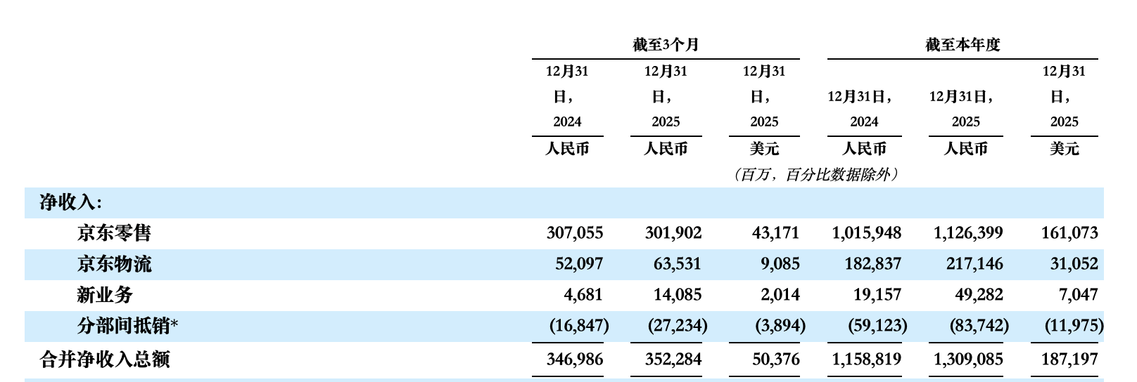 京东新业务包含京东外卖、京东产发、京喜及海外业务等。2025年全年,该业务板块营收同比增长157.3%至493亿元,但经营亏损466亿元。在财报电话会上,许冉表示,京东外卖2025年已在研发层面完成大幅调整,预计2026年外卖业务总投入将比2025年有所降低。不过,她也强调,“当然这取决于外卖市场的竞争态势”。