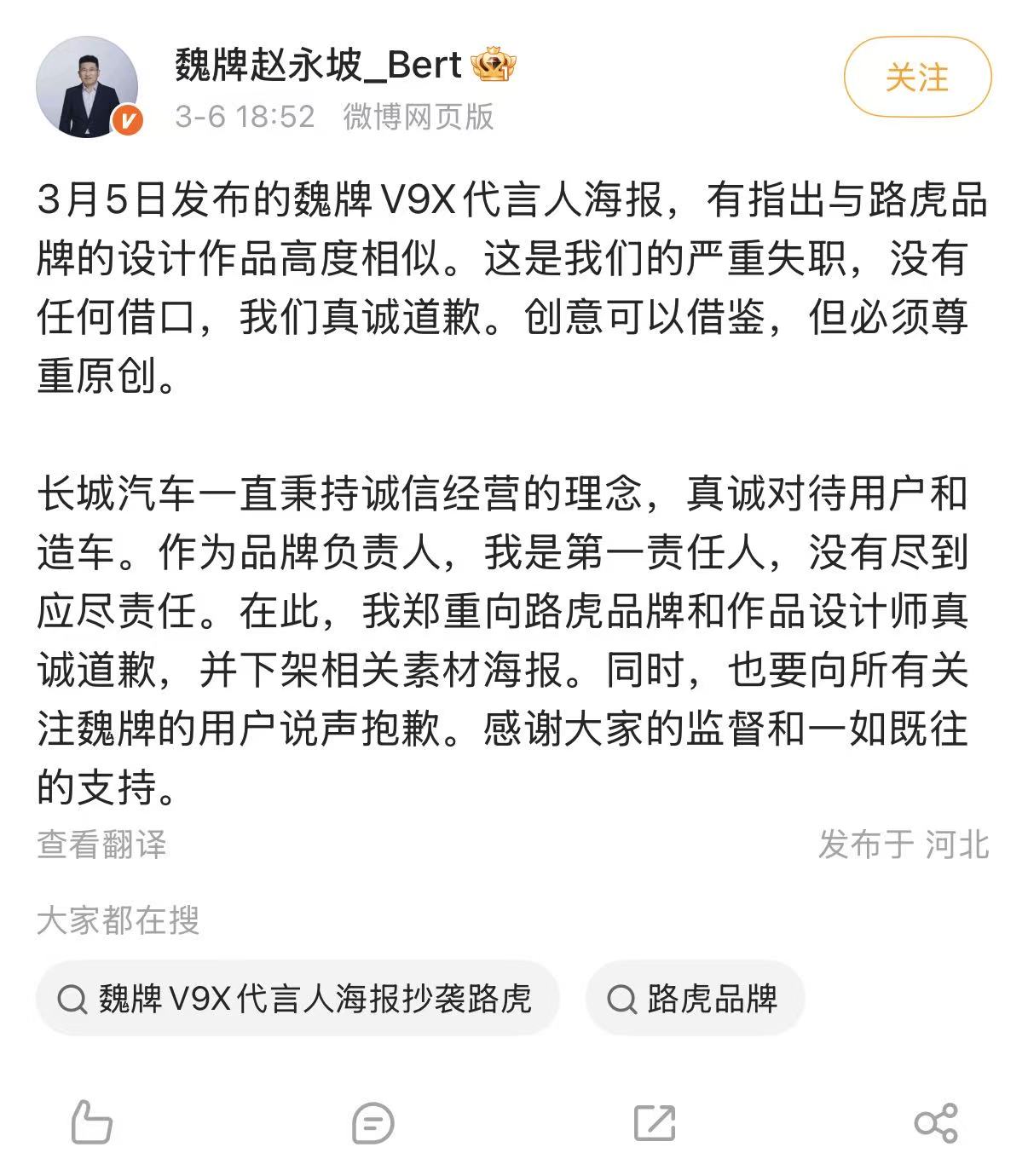 此外,魏牌CEO赵永坡也在社交平台发文致歉称:“3月5日发布的魏牌V9X代言人海报,有指出与路虎品牌的设计作品高度相似。这是我们的严重失职,没有任何借口,我们真诚道歉。创意可以借鉴,但必须尊重原创。”