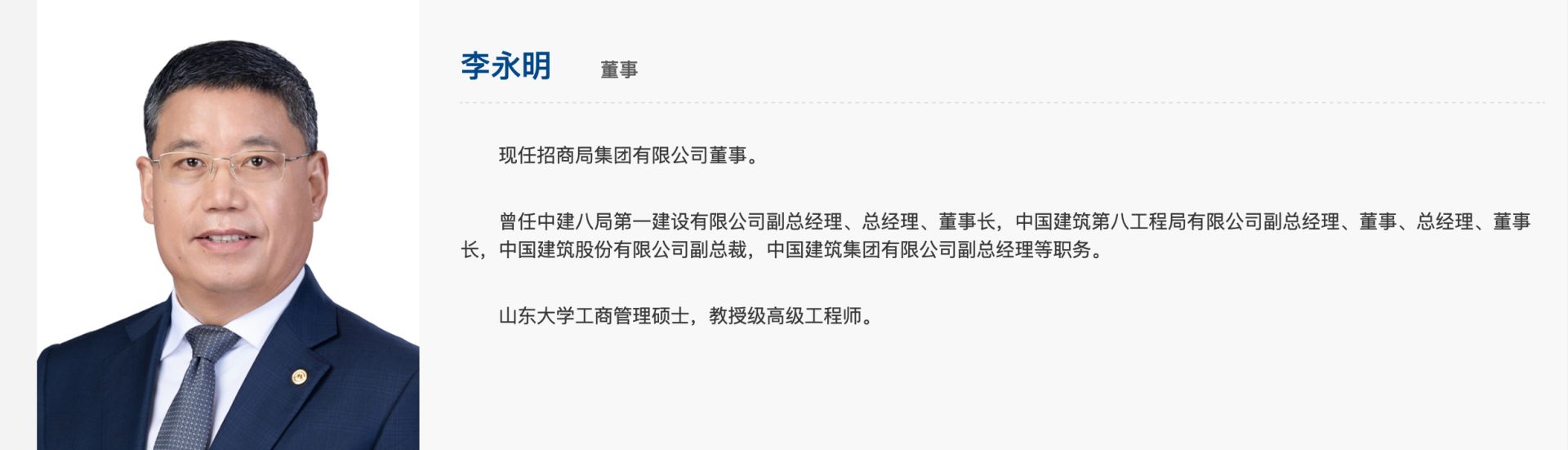 近日,李永明的名字首次出现在招商局集团官网的董事会名单,仅次于董事长缪建民、总经理石岱,排在第三序位,目前的职务是董事。