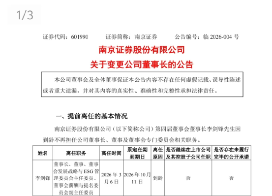 3月6日晚间,南京证券发布公告,宣布董事长发生变更。李剑锋因到龄原因,于3月6日提前离任公司董事长、董事及董事会相关专门委员会职务。