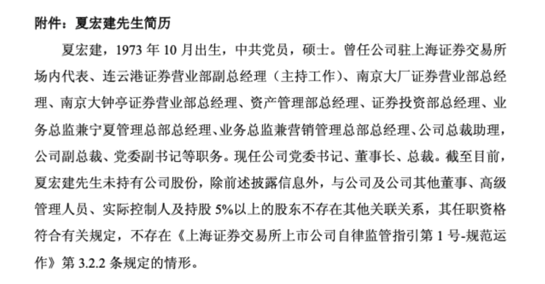 新任董事长夏宏建是南京证券体系内成长起来的高管。履历显示,夏宏建出生于1973年10月,拥有硕士学位,1992年加入南京证券,曾任公司资产管理部总经理、证券投资部总经理、业务总监兼多个总部总经理、总裁助理、副总裁等职务,是名副其实的“老南证人”。