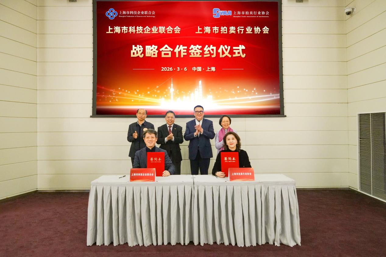会上,上海市科技企业联合会与上海市拍卖行业协会正式签署战略合作协议。上海市科技企业联合会副会长潘厚泉与上海市拍卖行业协会副会长黄玮签约。章毅,上海市拍卖行业协会会长刘建民,上海市工商联党组成员、副主席杨茜,上海市科委二级巡视员李祖兴见证签约。双方将充分发挥各自资源优势,在科技成果转化、知识产权交易、企业价值评估等领域开展深度合作,为会员企业提供多元化的增值服务。