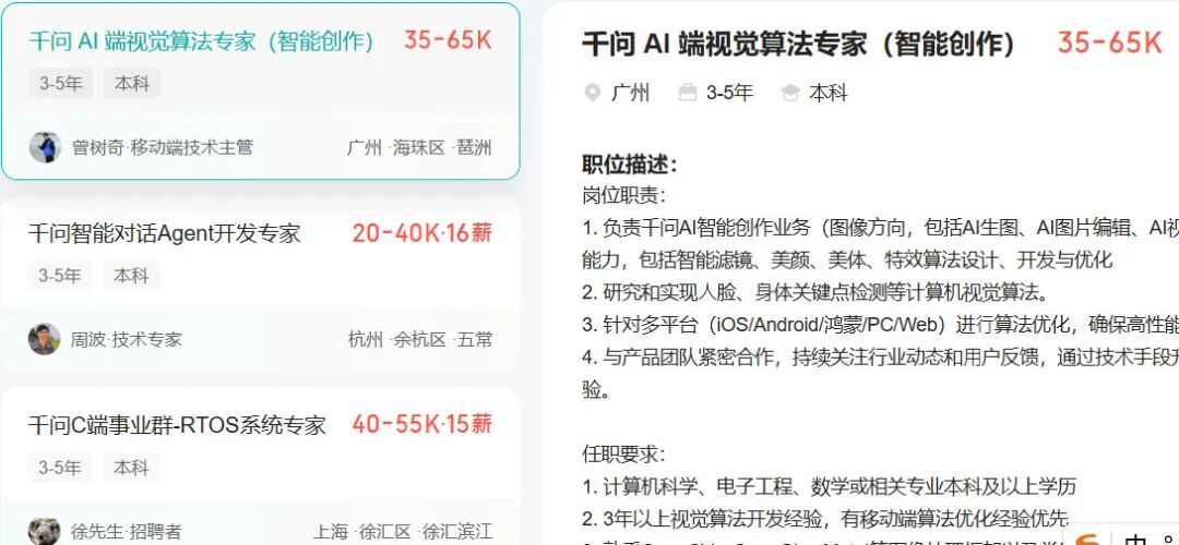 《21CBR》记者发现,3月6日,在BOSS直聘上,阿里更新岗位信息,如千问智能对话Agent开发专家、AI图像&视频编辑研发等。其中,视觉算法专家岗位,开出最高6.5万的月薪。