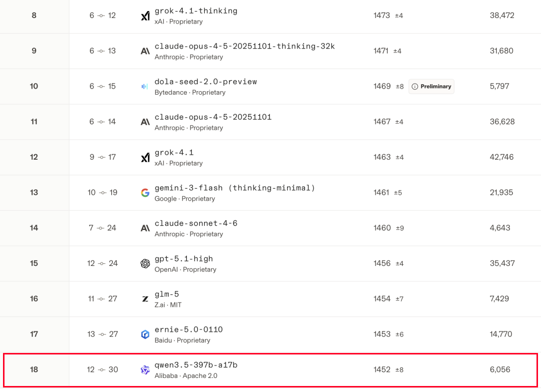 截至2月底,在权威盲测平台LMArena上,千问的旗舰模型Qwen3.5-397B,仅排名第18。
