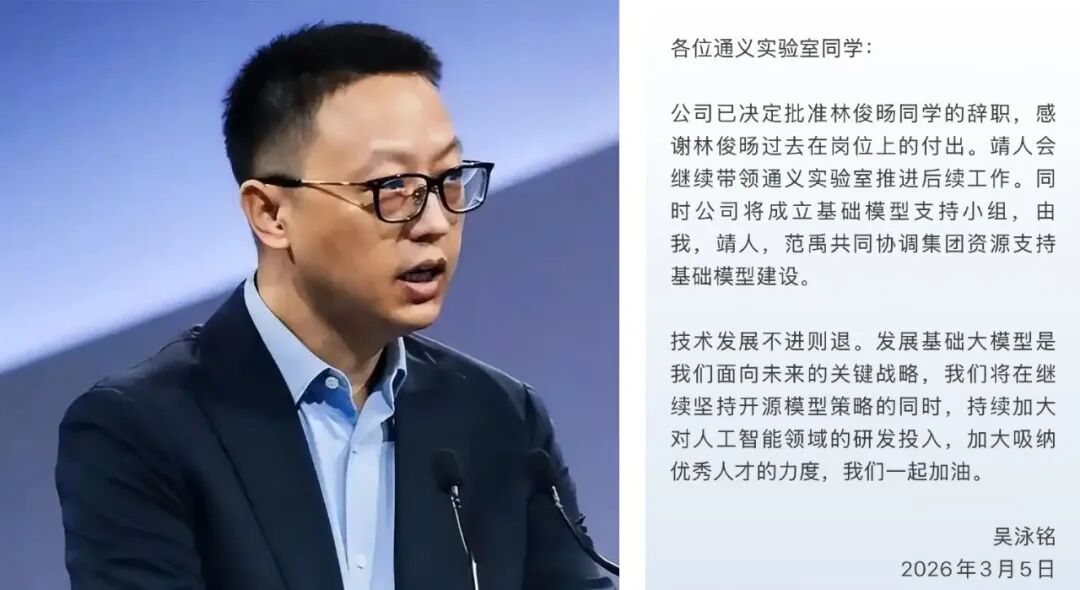 阿里集团CEO吴泳铭,3月5日,发邮件定调,批准千问(Qwen)技术负责人林俊旸辞职;并宣布,由周靖人继续带队,推进通义实验室后续工作。