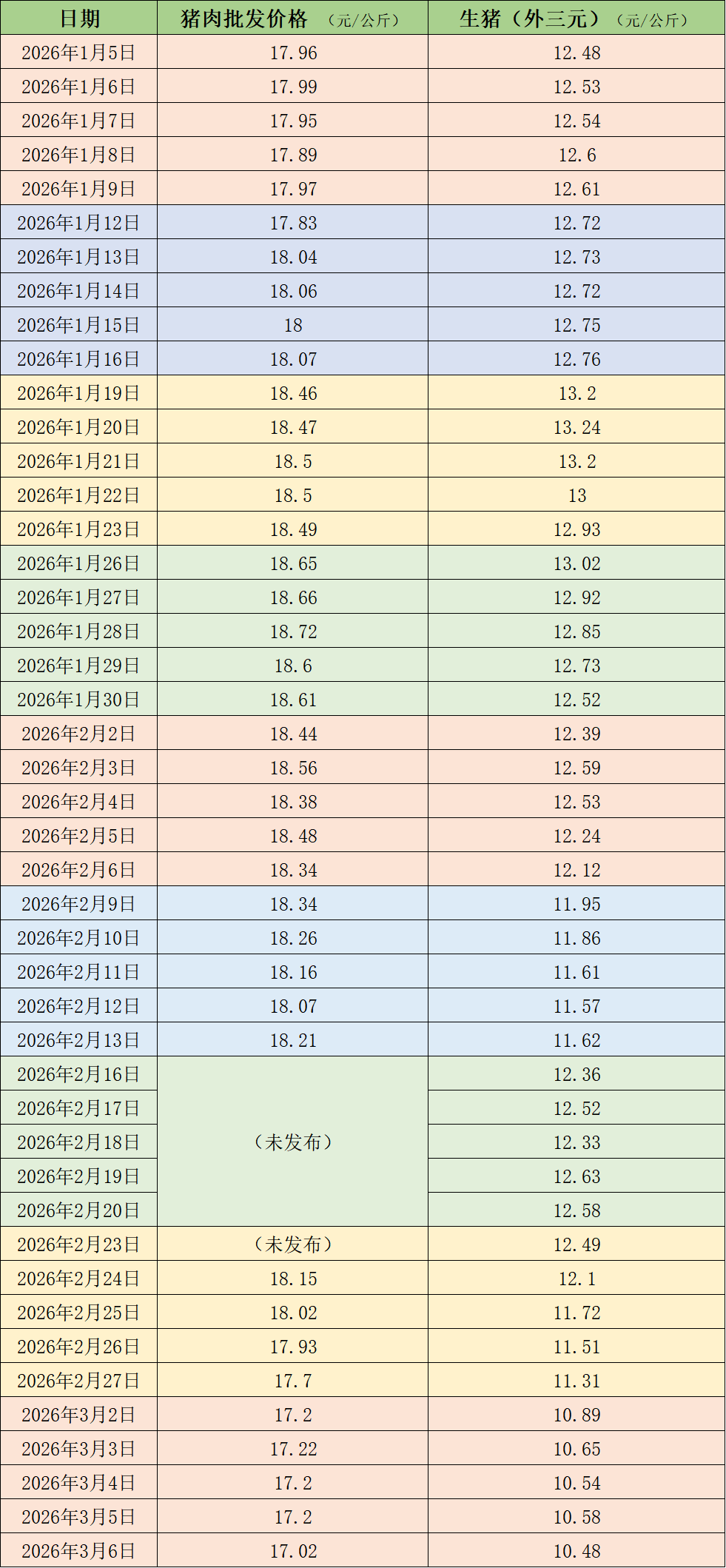 近期的猪肉和生猪价格。制表澎湃新闻