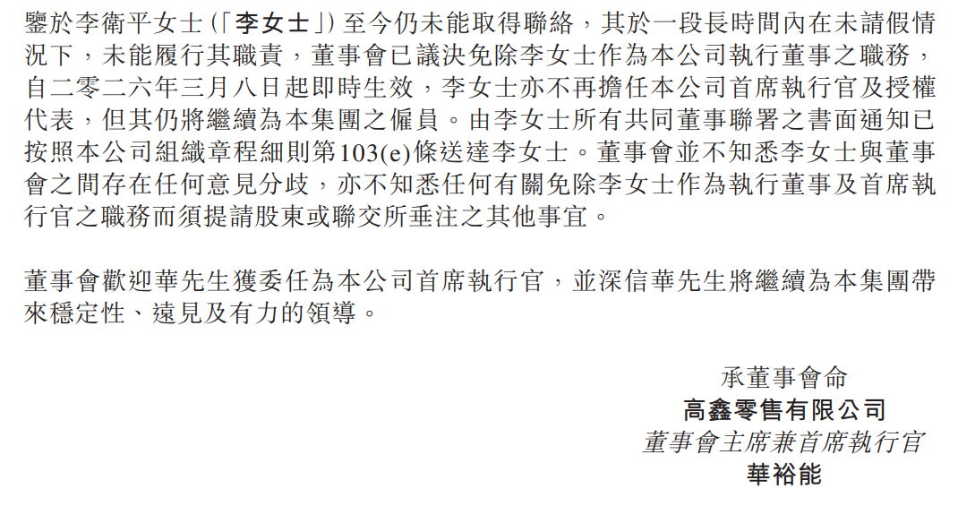 3月8日,大润发母公司高鑫零售(06808)公告称,鉴于李卫平女士至今仍未能取得联络,其于一段长时间内在未请假情况下,未能履行其职责,董事会已议决免除李女士作为本公司执行董事之职务,自3月8日起即时生效。董事会主席华裕能已获委任为本公司首席执行官、由非执行董事调任为执行董事,并获委任为本公司之授权代表,自3月8日起生效。