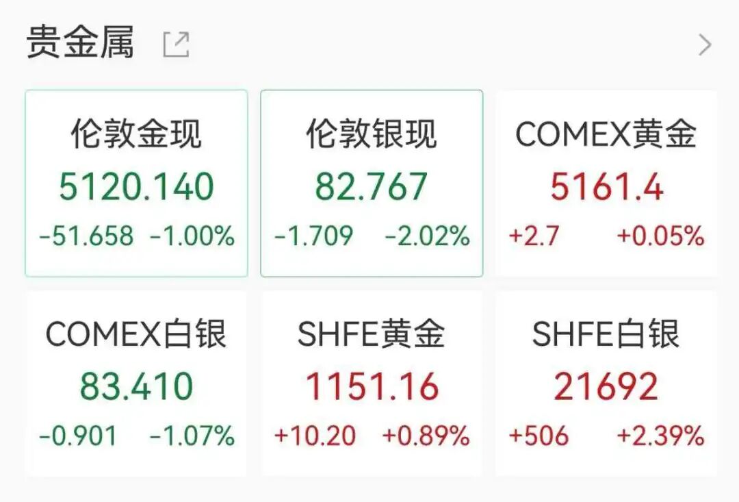 贵金属方面,现货黄金、现货白银下挫,截至发稿,现货黄金跌1%报5120.14美元/盎司,现货白银跌超2%报82.767美元/盎司。