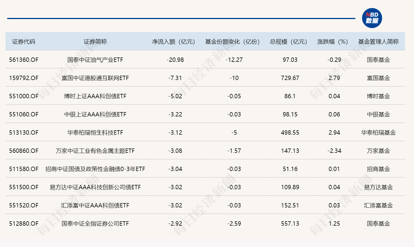 与此同时,国泰中证油气产业ETF基金份额减少12.27亿份,净流出额20.98亿元;富国中证港股通互联网ETF基金份额减少10.00亿份,净流出额7.31亿元;博时上证AAA科创债ETF基金份额减少0.05亿份,净流出额5.02亿元。
