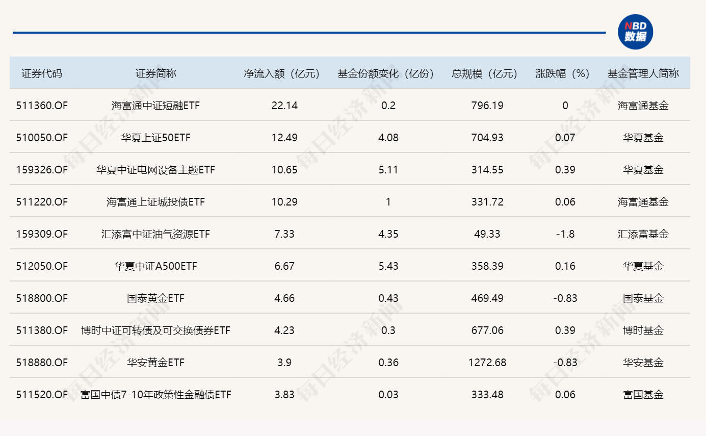 Wind数据显示,在3月6日的非货币ETF市场中,海富通中证短融ETF基金份额增加0.20亿份,净流入额22.14亿元;华夏上证50ETF基金份额增加4.08亿份,净流入额12.49亿元;华夏中证电网设备主题ETF基金份额增加5.11亿份,净流入额10.65亿元。