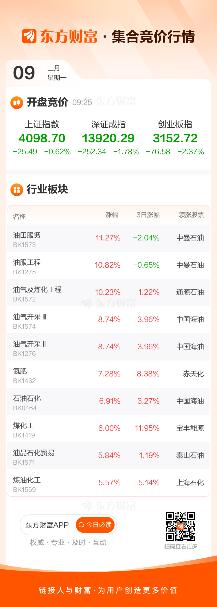 3月9日,三大指数集体低开,上证指数低开0.62%,深证成指低开1.78%,创业板指低开2.37%。板块方面,油田服务领涨,中曼石油涨10.01%,油服工程、油气及炼化工程等开盘涨幅居前。