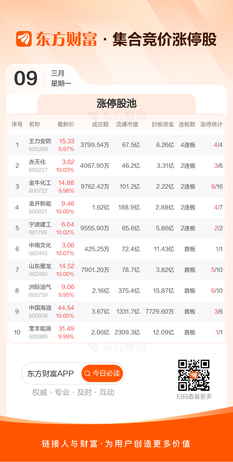 3月9日集合竞价:王力安防4连板 赤天化2连板
