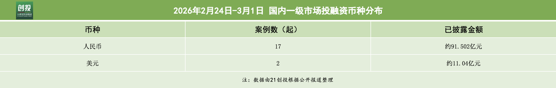 21创投不完全统计,3月2日—3月8日,国内一级市场共披露融资事件25起,覆盖科技与制造、医疗健康、消费服务三大领域。其中有19笔融资披露了融资金额和币种信息,已披露融资总规模合计超100亿人民币。