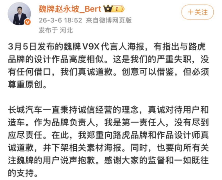 魏牌CEO赵永坡也同步在社交平台发文致歉,称此次事件是团队的严重失职,没有任何借口,同时强调“创意可以借鉴,但必须尊重原创”。