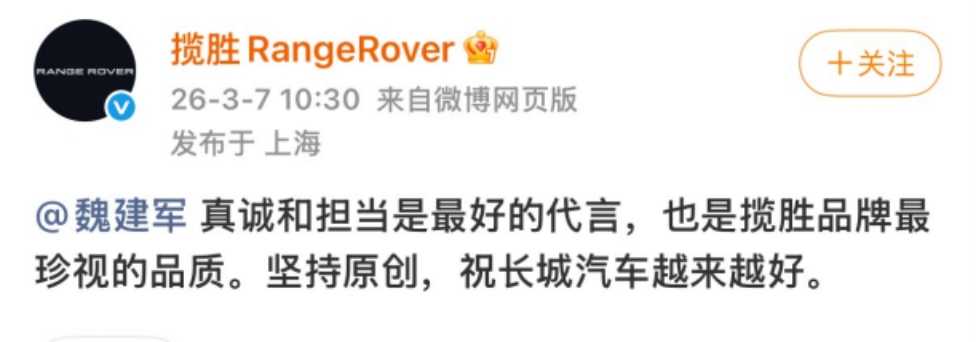 3月7日,揽胜官方微博针对此次事件发布回应,称“真诚和担当是最好的代言,也是揽胜品牌最珍视的品质”,在重申坚持原创立场的同时表示“祝长城汽车越来越好”。