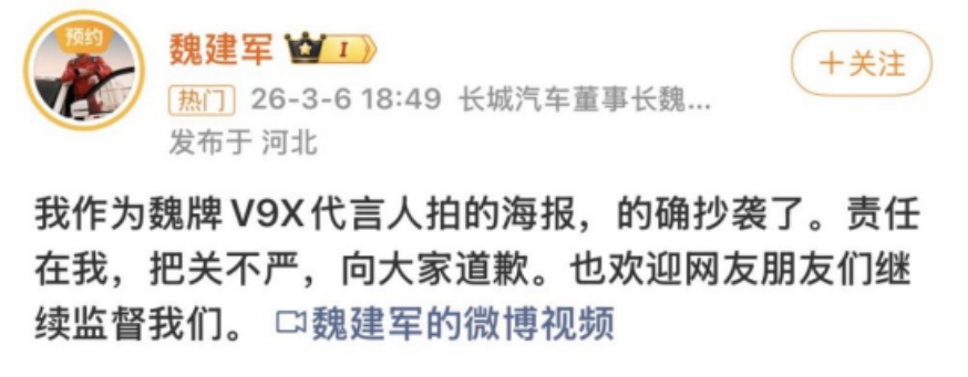 近日,长城汽车董事长魏建军就旗下魏牌V9X代言海报涉嫌抄袭路虎揽胜运动版海报一事发布视频公开致歉,明确承认抄袭事实并表示愿承担全部法律与经济责任。