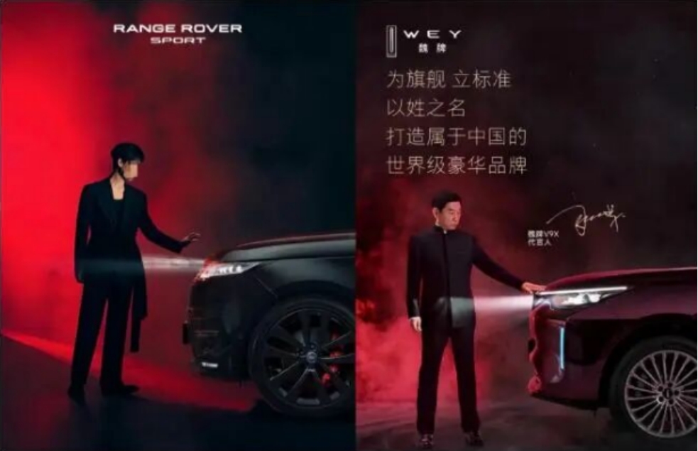 同时,有网友发布对比图指出,该海报与路虎揽胜运动版的广告海报高度雷同,二者在暗红背景、人物与车身的构图方式、车辆展示角度、灯光走向及人物站姿上高度一致,仅手部动作存在细微差异,有网友还直言该创意被“等比抄袭”。