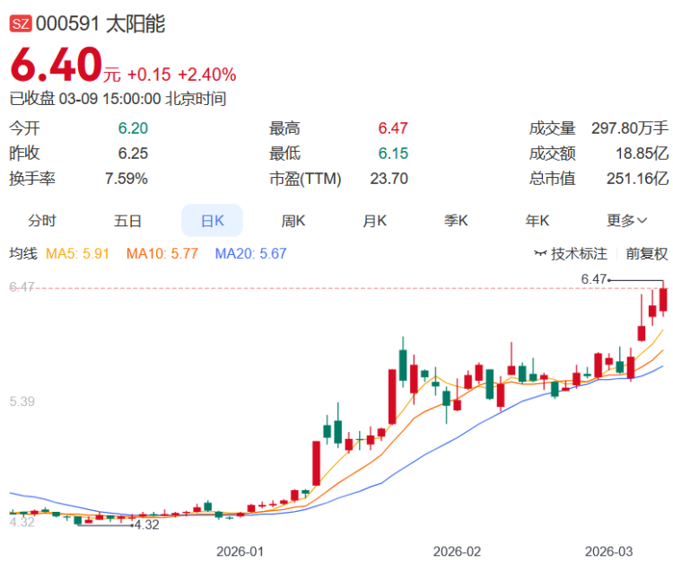 太阳能报收6.40元,日涨幅2.40%,换手率7.59%,列第三,今年以来的涨幅为46.12%。