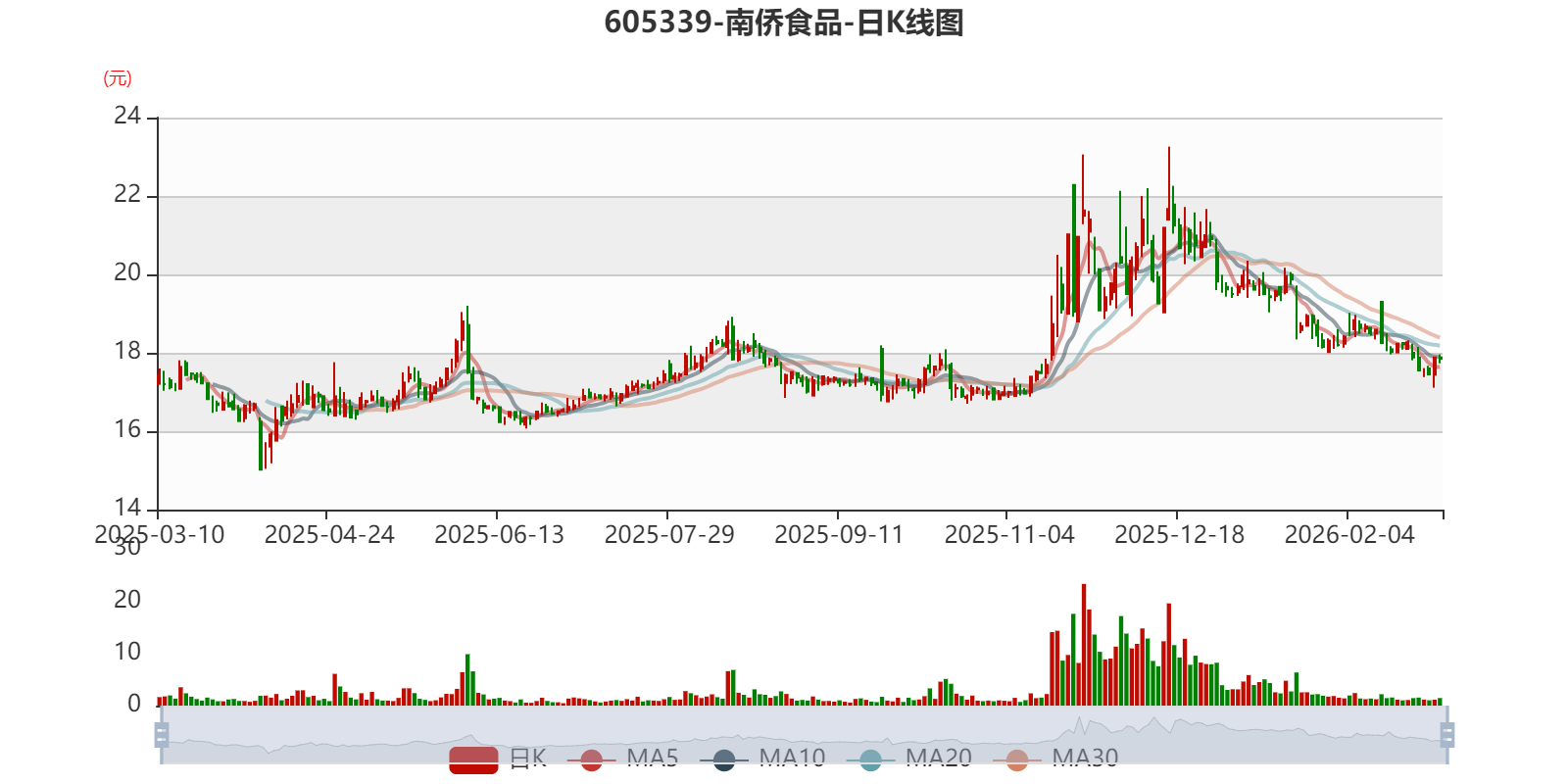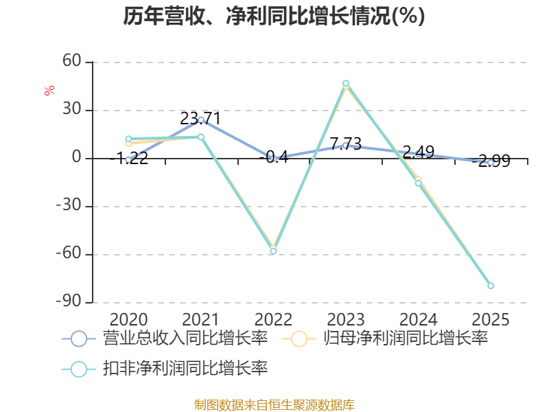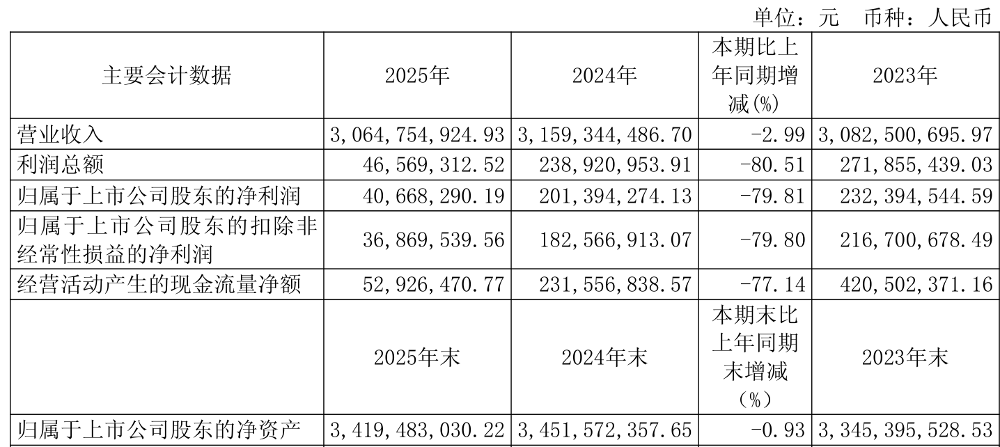 中证智能财讯南侨食品(605339)3月10日披露2025年年度报告。2025年,公司实现营业总收入30.65亿元,同比下降2.99%;归母净利润4066.83万元,同比下降79.81%;扣非净利润3686.95万元,同比下降79.80%;经营活动产生的现金流量净额为5292.65万元,同比下降77.14%;报告期内,南侨食品基本每股收益为0.1元,加权平均净资产收益率为1.19%。公司2025年度分配预案为:拟向全体股东每10股派现0.3元(含税)。