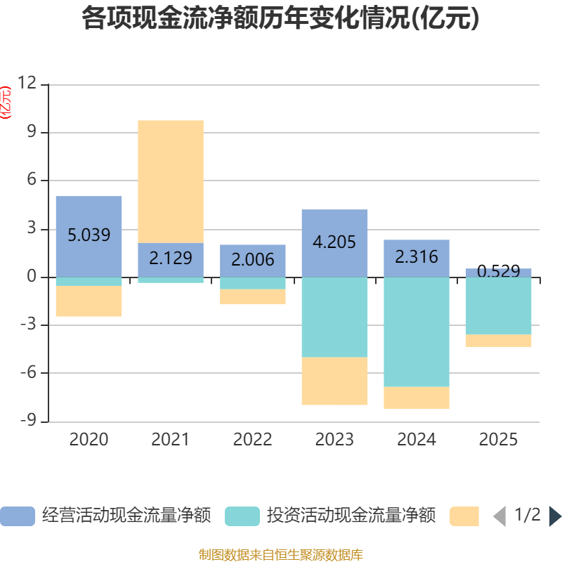 截至2025年,公司经营活动现金流净额为5292.65万元,同比下降77.14%;筹资活动现金流净额-7772.31万元,同比增加5900.68万元;投资活动现金流净额-3.59亿元,上年同期为-6.84亿元。