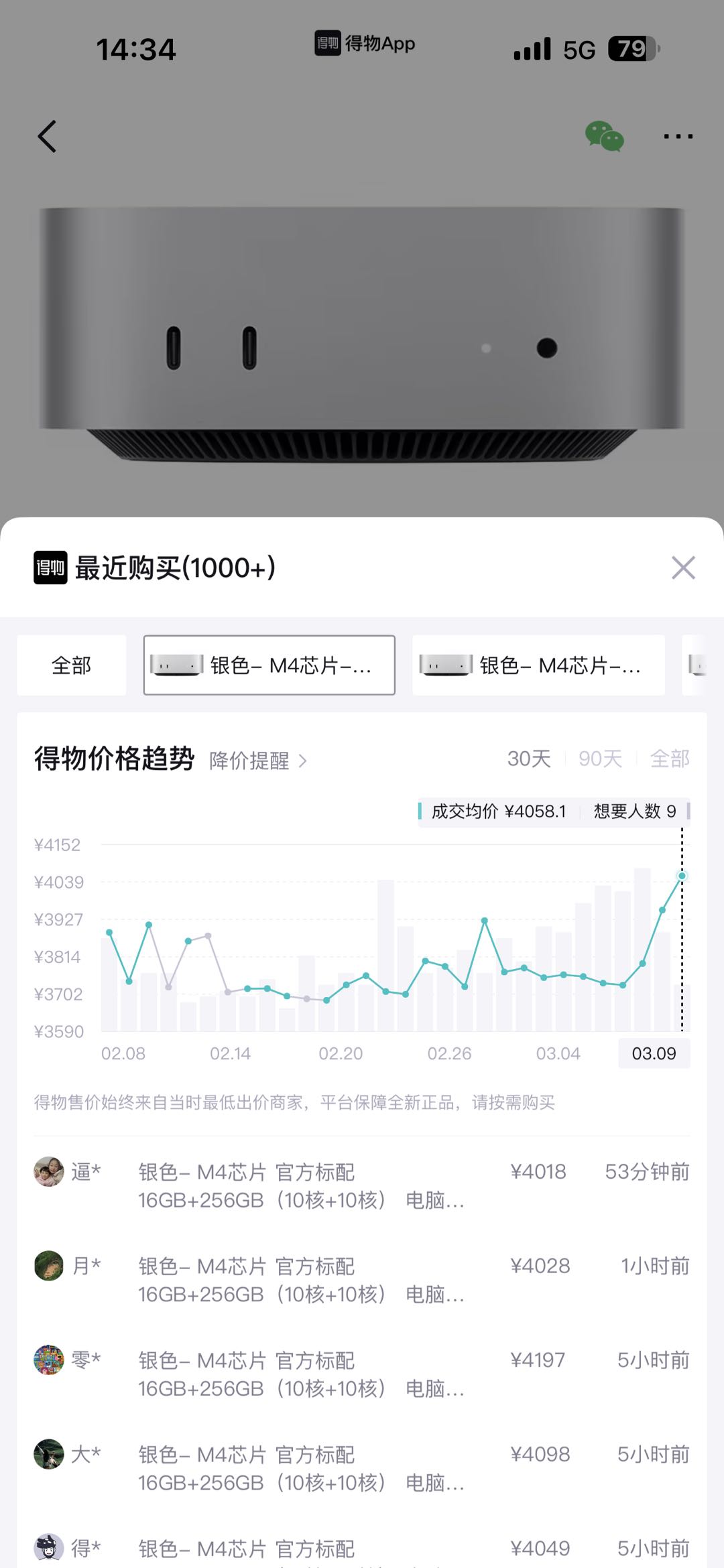Mac Mini M4在平台上溢价。得物App截图