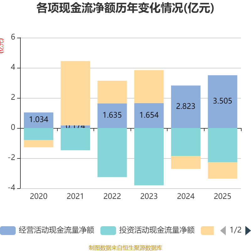截至2025年,公司经营活动现金流净额为3.5亿元,同比增长24.18%;筹资活动现金流净额-1.09亿元,同比减少2330.15万元;投资活动现金流净额-2.27亿元,上年同期为-1.86亿元。