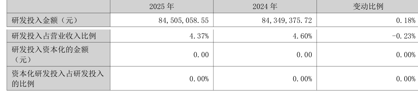 2025年全年,公司研发投入金额为8450.51万元,同比增长0.18%;研发投入占营业收入比例为4.37%,相比上年同期下降0.23个百分点。此外,公司全年研发投入资本化率为0%。