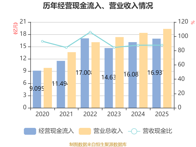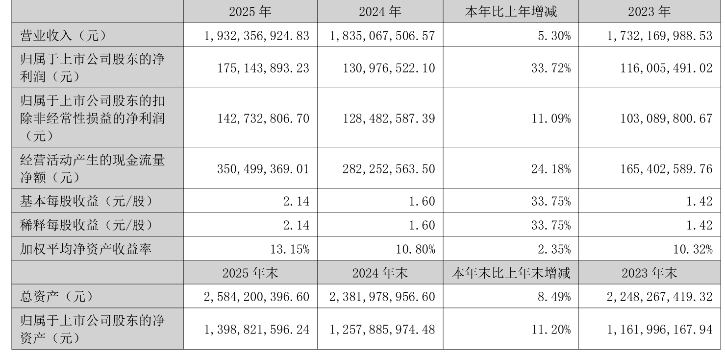 中证智能财讯征和工业(003033)3月10日披露2025年年度报告。2025年,公司实现营业总收入19.32亿元,同比增长5.30%;归母净利润1.75亿元,同比增长33.72%;扣非净利润1.43亿元,同比增长11.09%;经营活动产生的现金流量净额为3.5亿元,同比增长24.18%;报告期内,征和工业基本每股收益为2.14元,加权平均净资产收益率为13.15%。公司2025年度分配预案为:拟向全体股东每10股派现5元(含税)。