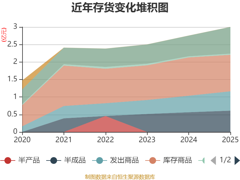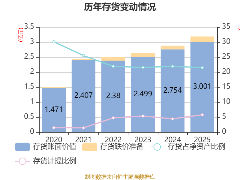 从存货变动来看,截至2025年末,公司存货账面价值为3亿元,占净资产的21.45%,较上年末增加2471.66万元。其中,存货跌价准备为1826.82万元,计提比例为5.74%。